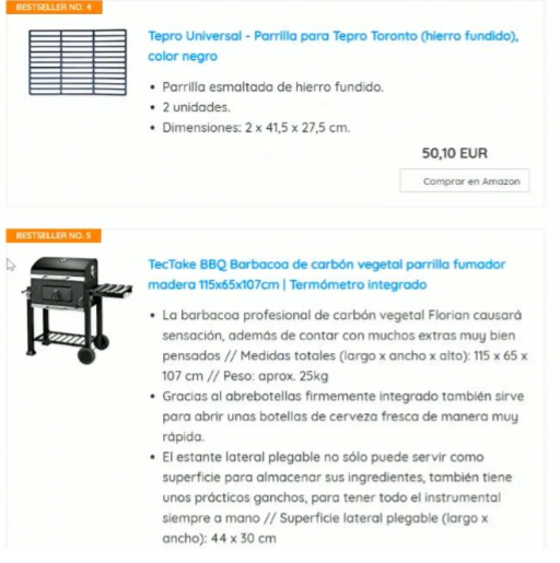 Por ejemplo, si seleccionamos el formato de plantilla «lista», podremos eliminar el texto de las descripciones de los productos, que no dejan de ser contenido duplicado de Amazon y si son muy largas y mostramos bastantes productos, obligan a hacer mucho scroll.