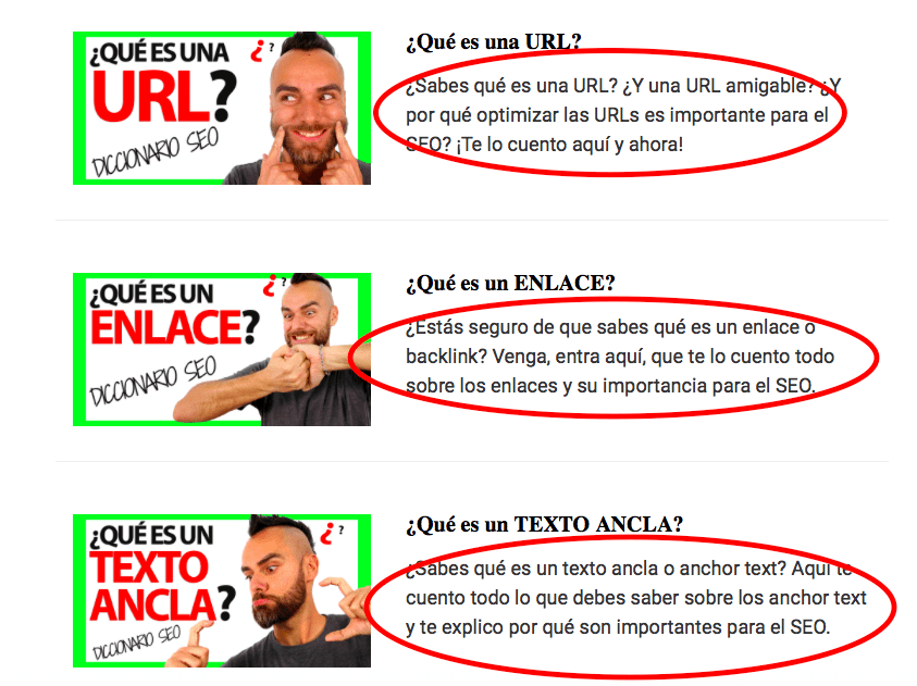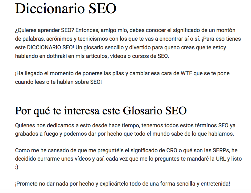 Y eso es lo que estoy haciendo. Dentro de mi DICCIONARIO SEO estoy creando páginas diferentes para cada uno de estos términos: qué es un dominio, qué es el clickbait, etc etc. Estos artículos también van con vídeo, porque es algo que también estoy trabajando en Youtube aunque de una manera diferente, que ya te explicaré.