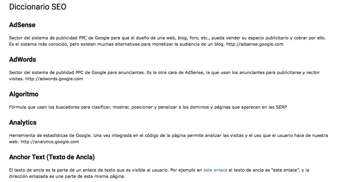 Realmente «Diccionario SEO» no es una palabra clave que tenga mucha competencia, pero es una sección que tienen muchos blogs de SEO y de marketing porque es una de las primeras búsquedas que hace la gente cuando quiere empezar a meterse en el mundo del SEO. Por lo tanto, los resultados de búsqueda están copados por webs de autoridad del sector.