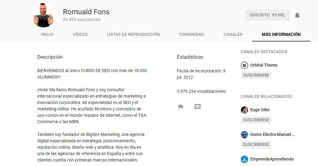 Escoge un buen nombre para tu canal, pues será la denominación que aparecerá en tus vídeos, en los resultados de búsqueda y lo que hará que la gente entienda de qué trata, ya sea tu nombre (como es mi caso, Romuald Fons), una marca, una categoría o un título descriptivo de aquello que vas a tratar.