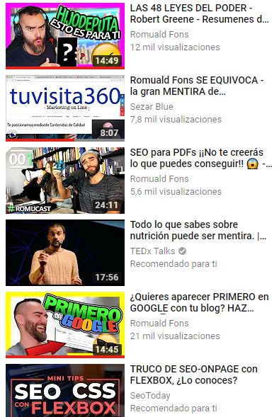 Aunque un buen posicionamiento de tus vídeos te dará visitas procedentes de las búsquedas en la plataforma, no hay que subestimar las que pueden llegarte desde los vídeos sugeridos (barra lateral en desktop y debajo del vídeo en reproducción en mobile).