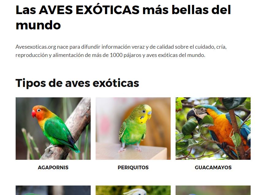 Aquí vemos parte de la homepage, desde donde podemos acceder a todas las páginas pilar, que son las más importantes para la web, como agapornis, periquitos o guacamayos. Dicho de otro modo, las palabras clave potentes.