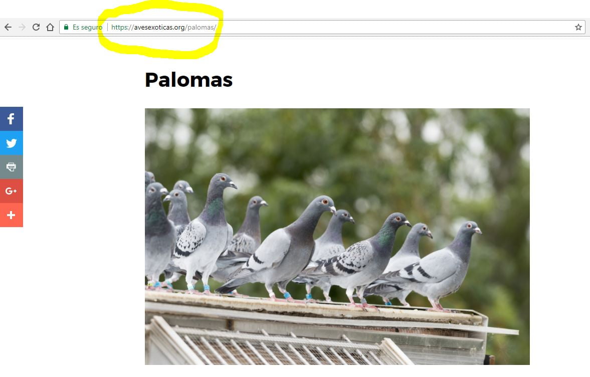 Ahora si clicamos en una de ellas, por ejemplo en Palomas, vemos que la URL es avesexoticas.org/palomas. En la lógica de las URLs, cuanto más cerca está una carpeta del root domain (el dominio) más importancia tiene jerárquicamente hablando.