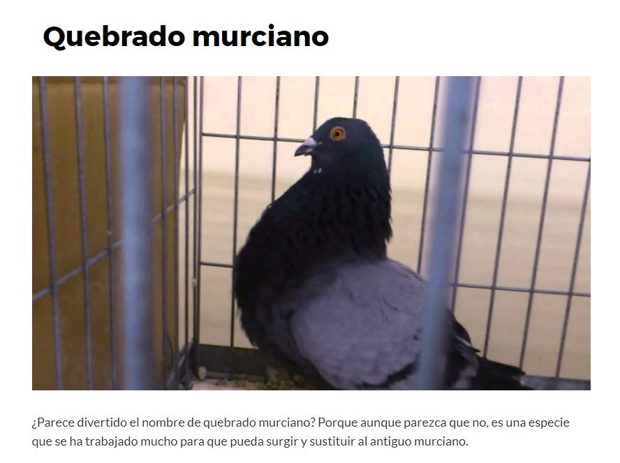 Pero, además, aquí volvemos a tener una navegación por clústers y si clicamos en «Quebrado murciano» aparece el artículo dedicado en concreto a esta variedad de paloma.