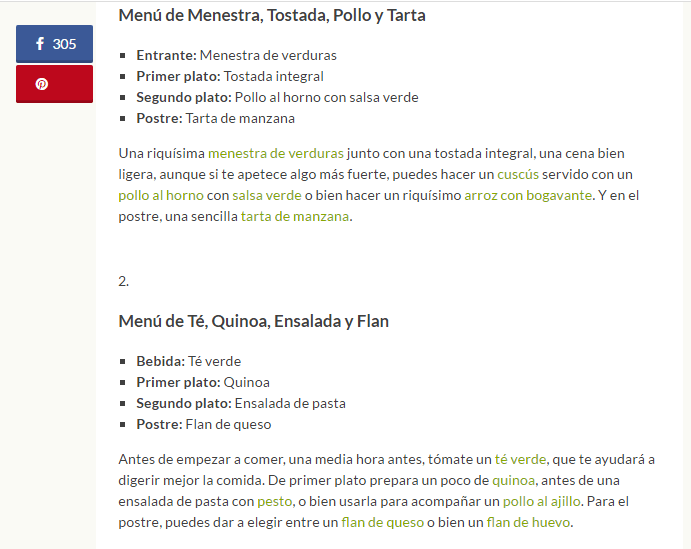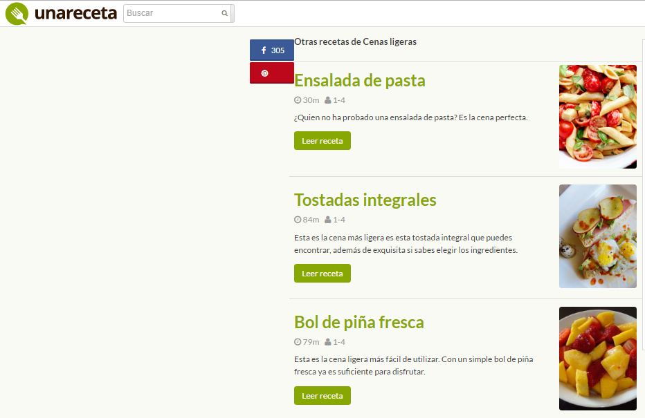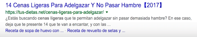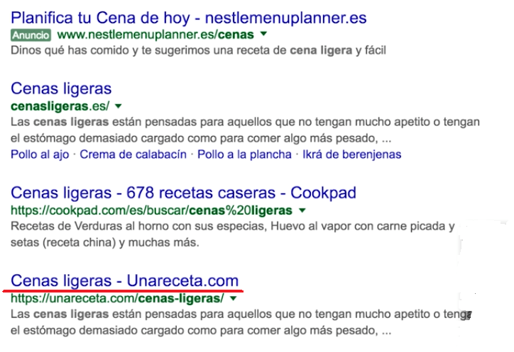 Además, tenemos la receta abierta que os decía, optimizada, con el H1 de cenas ligeras. Y, lo que está haciendo es crear contenido único, nuevo y diferente a la web en cada categoría. Es un texto pequeño. Realmente podría ser mejor, más largo, pero si con esto ya estamos segundos… Y seguramente con el tiempo acabaremos subiendo a primera posición. ¡Voy a por ti, tomadieta.com!