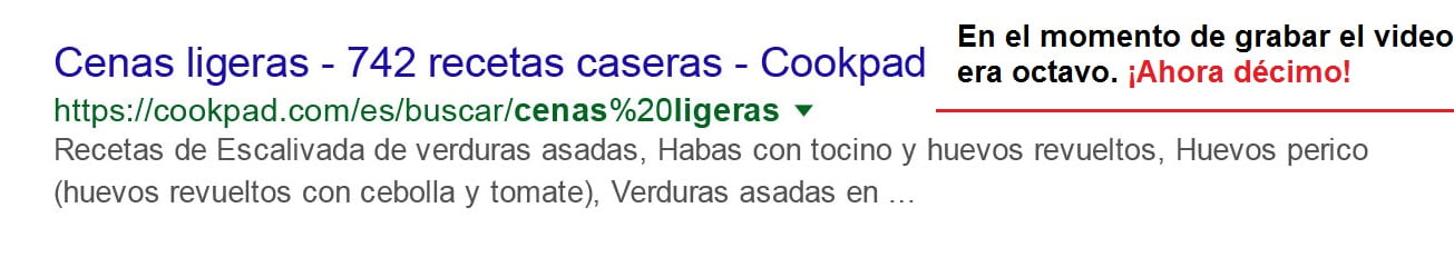 De hecho, en ‘pollo al horno’ habíamos bajado, pero ahora ya estamos en primera posición y Cookpad está tercero, que antes estaba por encima de nosotros para esta URL.