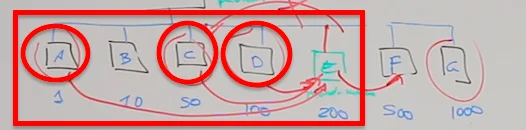 Google nos ha indicado que los artículos A, C, D y G son los más relevantes para la keyword «quebrado murciano». Pero lo que vamos a hacer es enlazar sólo desde aquellos con menos búsquedas. Y esto es, ni más ni menos, que interlinking en CADENA.