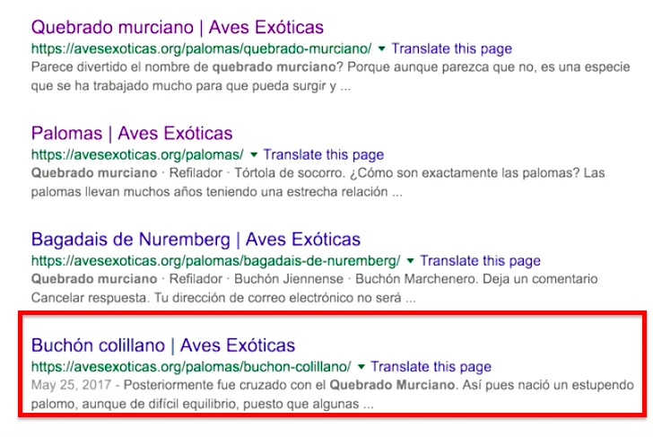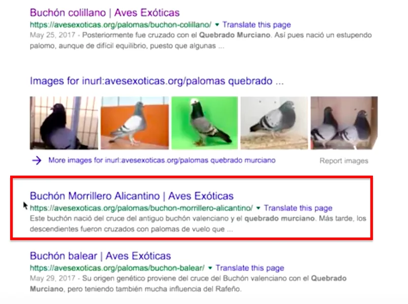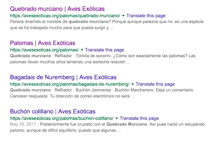 Con esto, le estamos diciendo a Google que busque dentro de todo su índice aquellas páginas que tienen en su URL «avesexoticas.org» y «palomas» y que son más relevantes para la palabra clave «quebrado murciano».