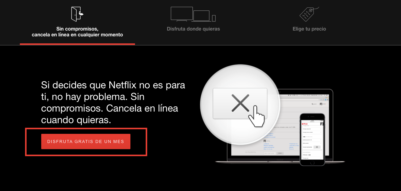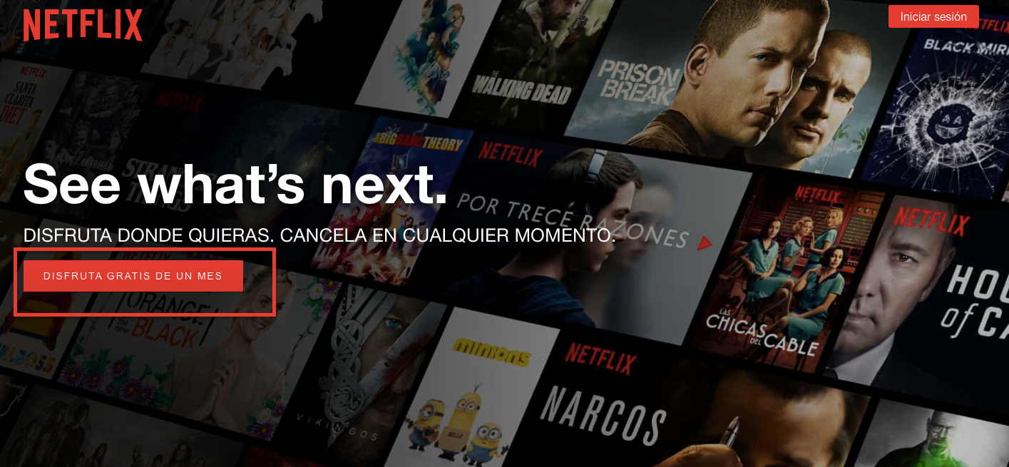 Mira este ejemplo de Netflix: en la parte superior de la landing page, sin tener que hacer scroll, ya te encuentras con el botón de llamada a la acción.