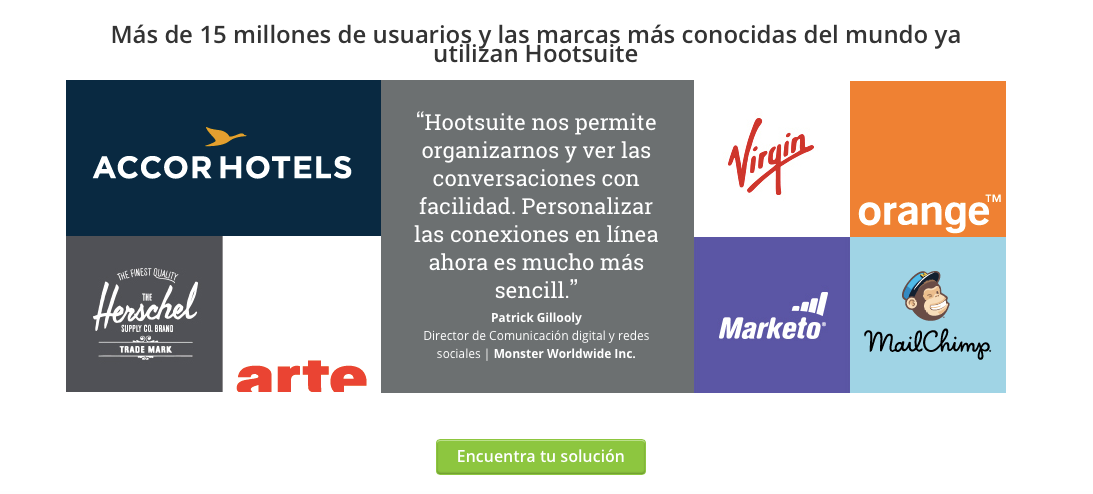 Otros avales de confianza son, por ejemplo, apariciones en medios de comunicación o incluir el nombre o logotipo de marcas reconocidas que ya han apostado por el producto o servicio, como en este ejemplo de Hootsuite: