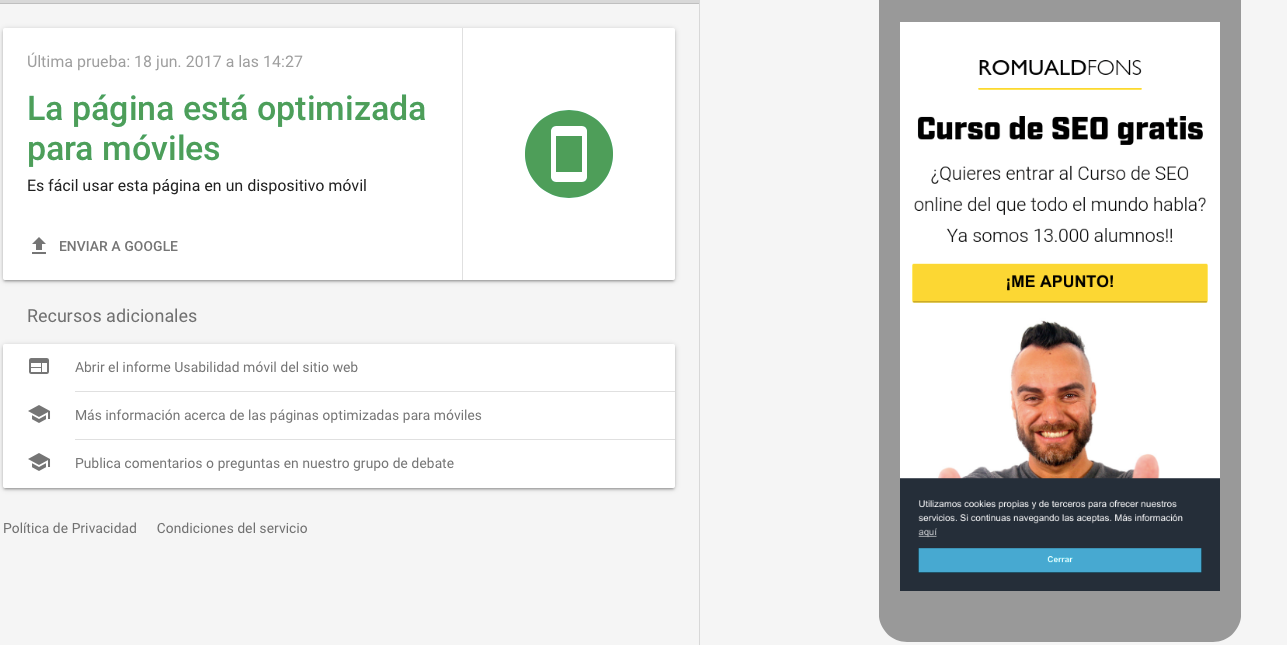 Con la herramienta Mobile Friendly Test de Google Search Console puedes verificar fácilmente si tu página está optimizada para dispositivos móviles.