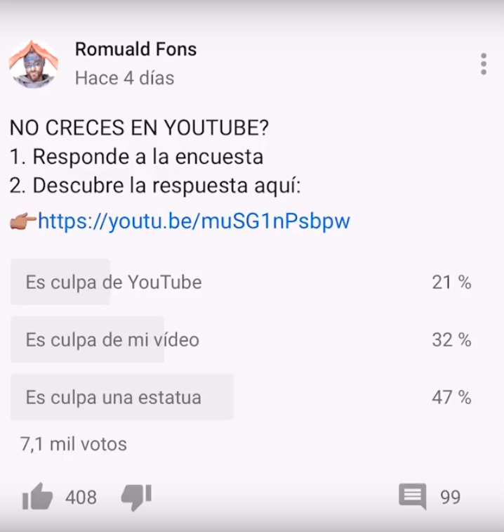 La gente que aterrizaba en mi pestaña de COMUNIDAD de Youtube se encontraba con esta encuesta.