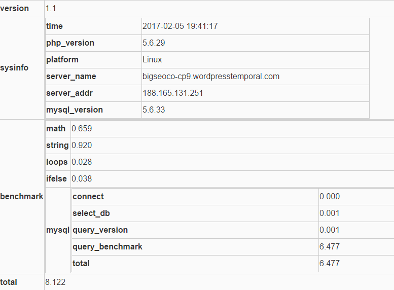 - CPU Benchmark: Una serie de operaciones que ponen a prueba la CPU para ver cuántas operaciones puede hacer el CMS por segundo. La unidad de medida es BogoWips (Bogus WP Instructions per Second).