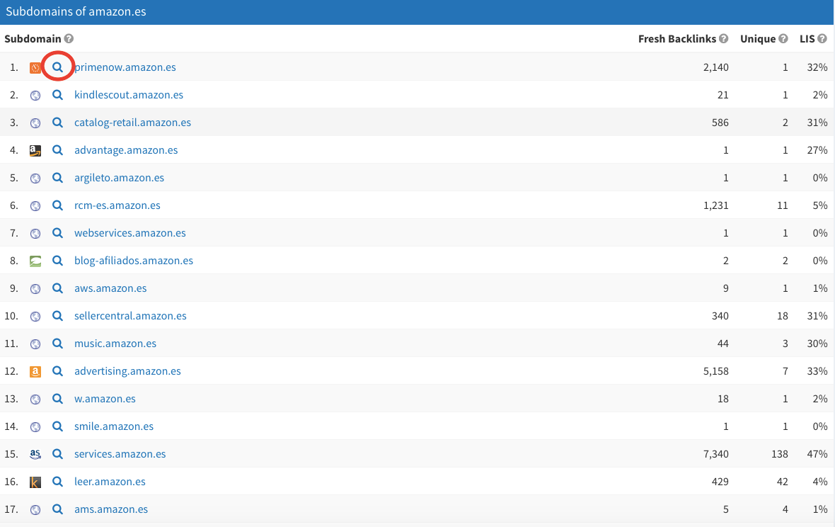 En el caso de amazon.es, nos encontramos con que tiene un total de 20 subdominios. La herramienta nos facilita un listado de esos 20 subdominios y nos indica cuántos backlinks activos tiene cada uno de ellos y de cuántos dominios proceden esos links.