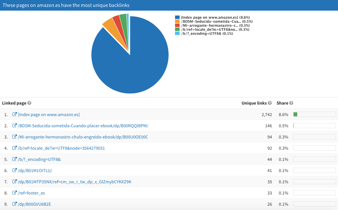 Este porcentaje habitualmente será bajo. En el caso de amazon.es, un 18,7% de sus enlaces entrantes son nofollow, lo que nos indica que el 81,3% son backlinks dofollow.