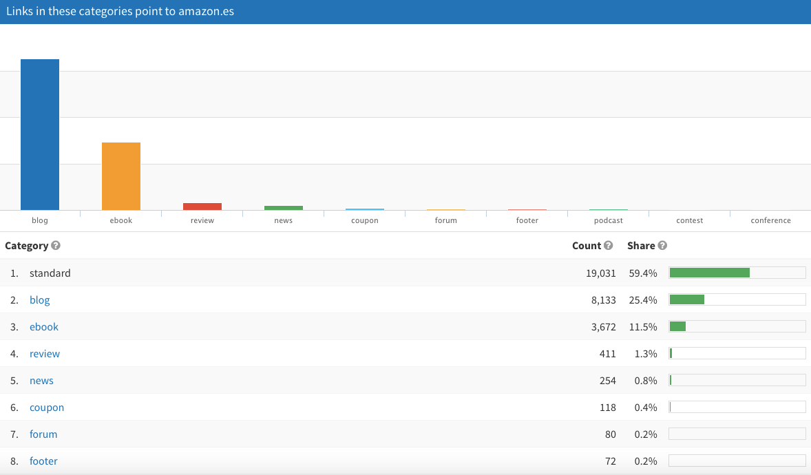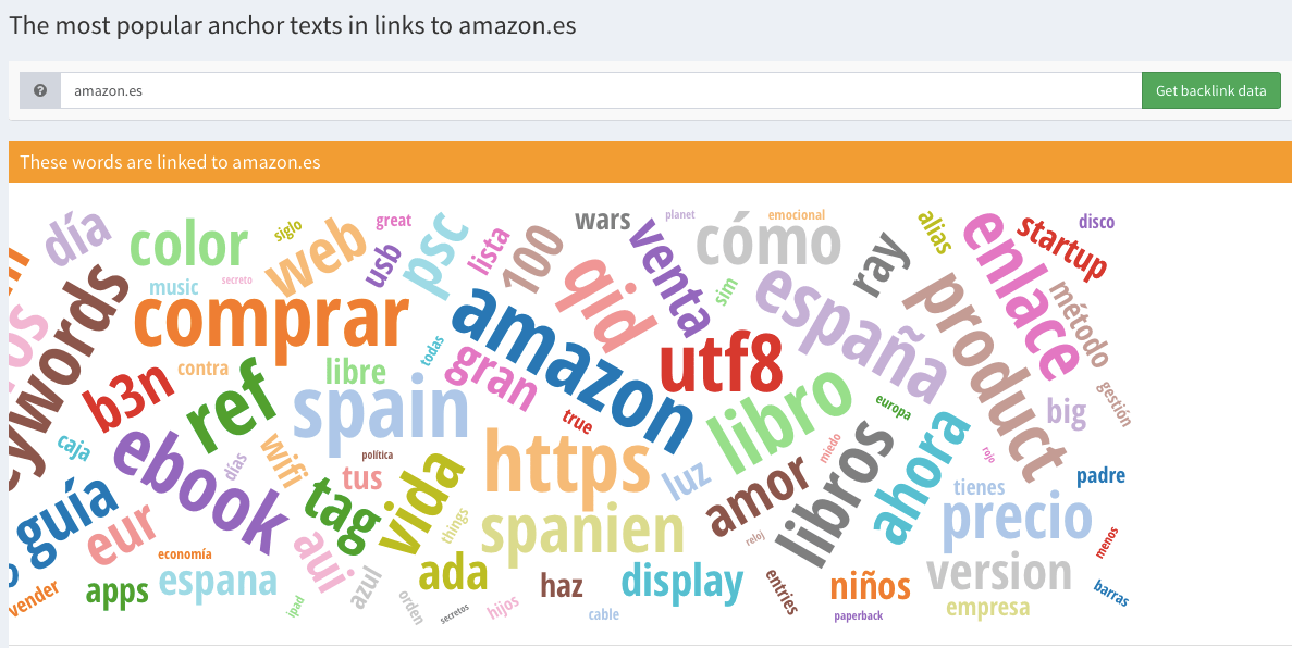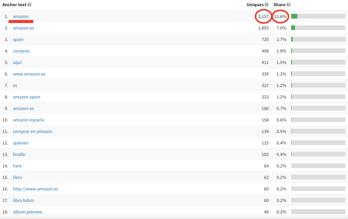 Por ejemplo, vemos que «amazon» es el texto ancla con el que más se enlaza al sitio web de amazon.es.
