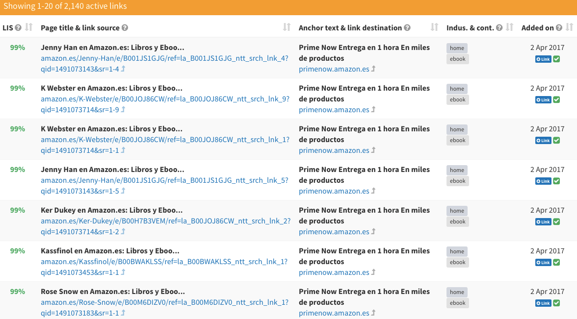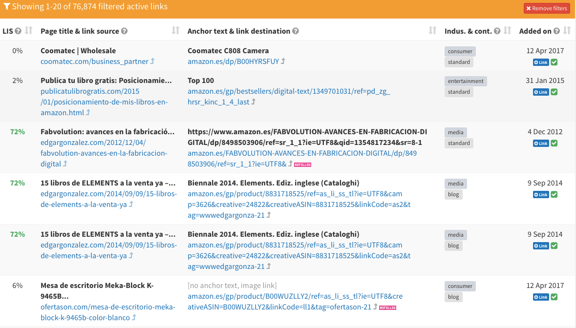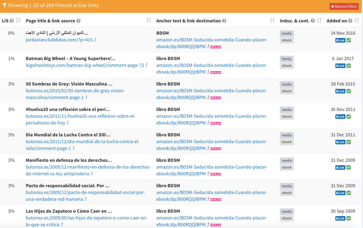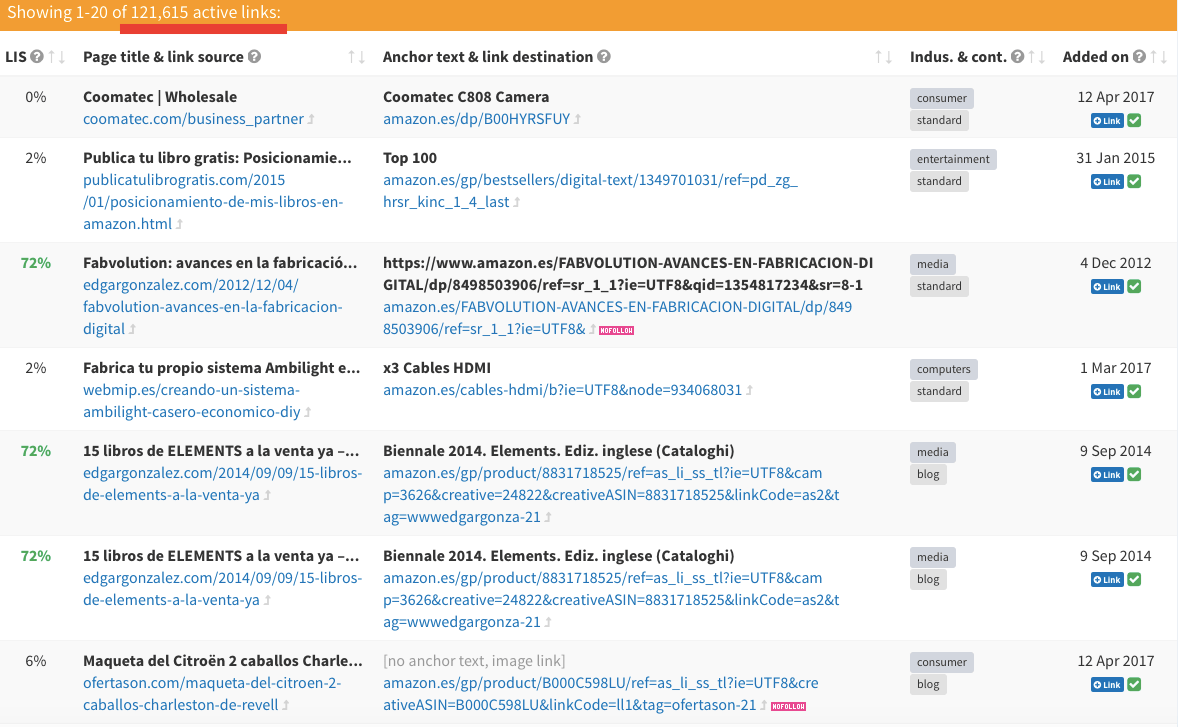 Si clicas en cualquier de los anchors text del listado, accederás directamente a la información filtrada de los enlaces que utilizan ese texto ancla en concreto y podrás conocer la URL de origen de ese enlace, la «autoridad» (LIS) de esa URL, la página de destino del enlace, el sector del dominio del que procede el enlace y la fecha en la que fue añadido ese link con ese anchor.