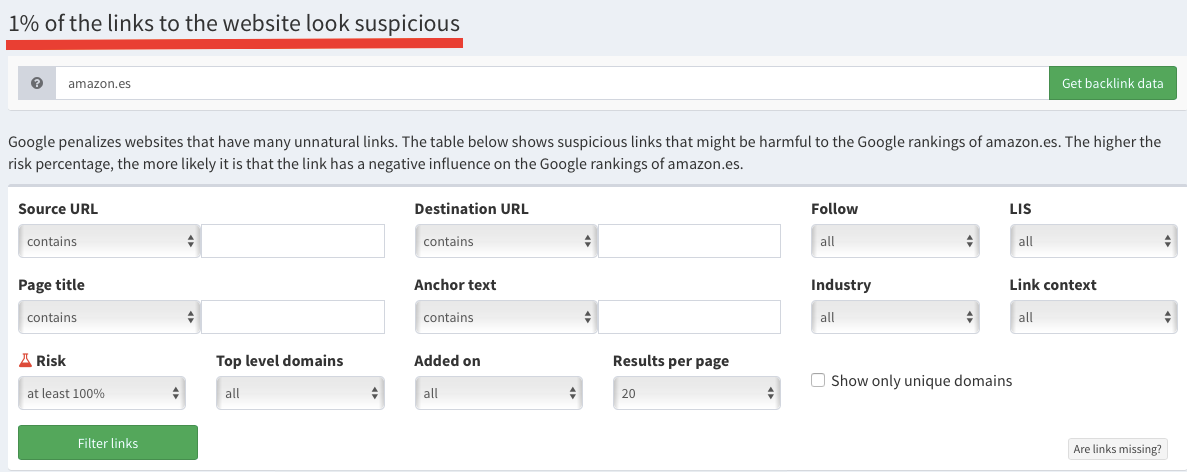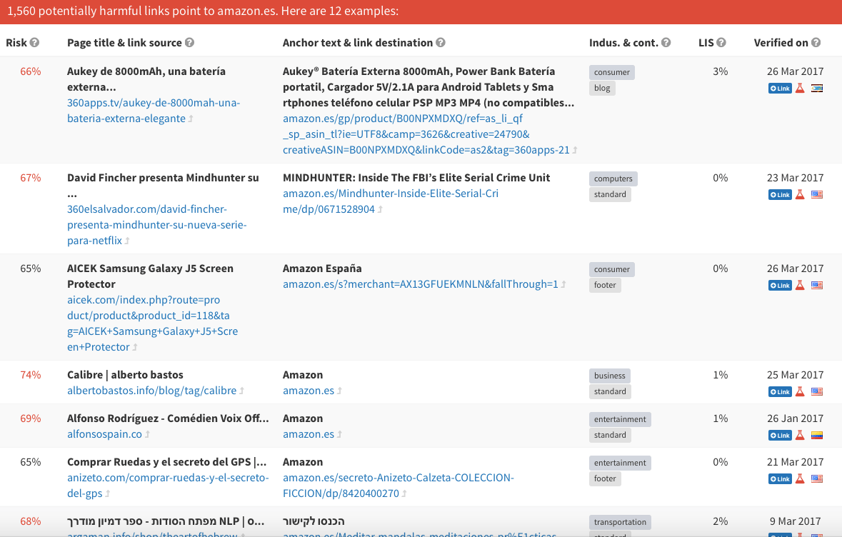 Vemos que, en el caso de amazon.es, la herramienta ha detectado un 1% de enlaces potencialmente peligrosos (1.560 enlaces sospechosos del total de 121.619).