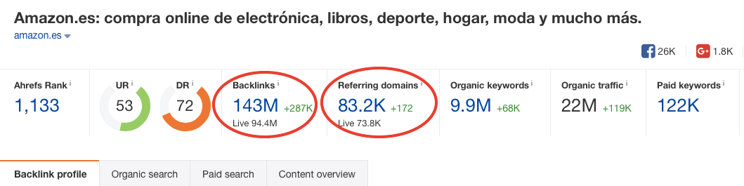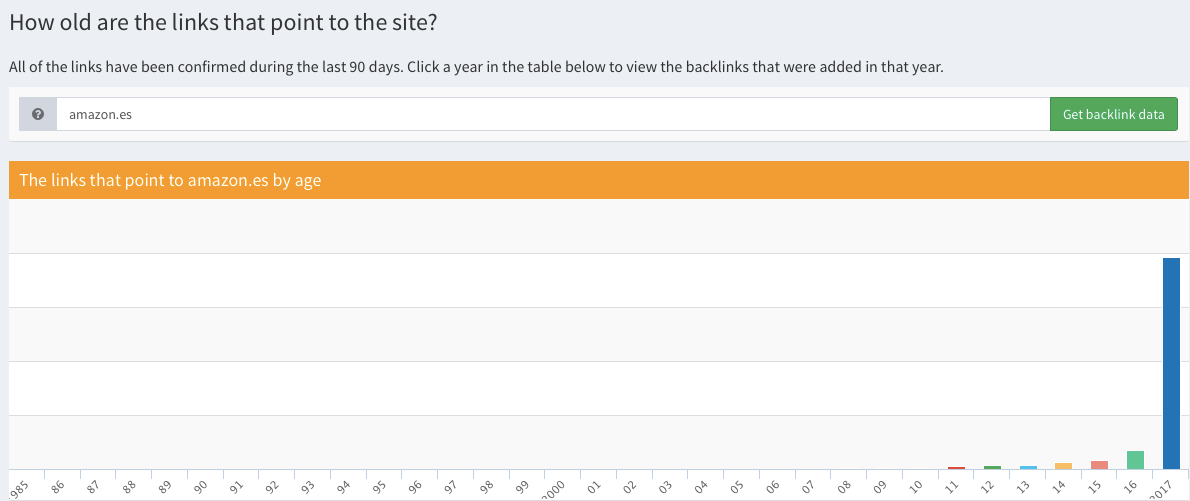 Vamos a ver con un ejemplo la información de backlinks que nos da cada herramienta para el dominio amazon.es. En ambos casos, los datos que nos da son de los enlaces que se han detectado que siguen activos en los últimos 90 días.