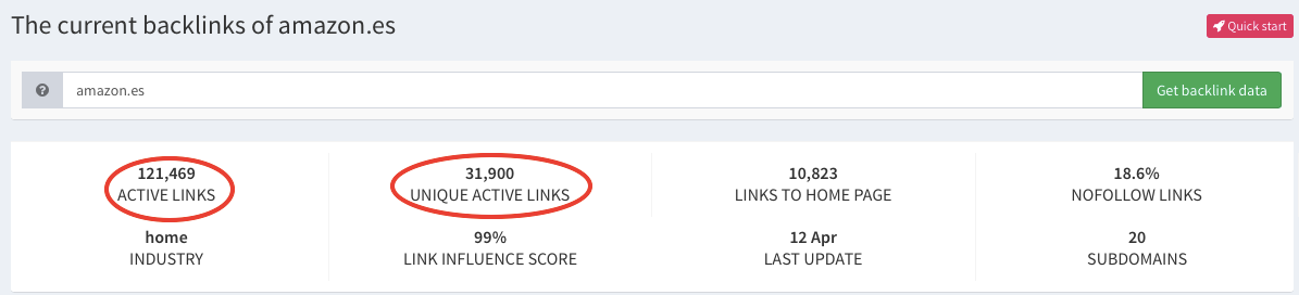Aquí nos incluye todos los enlaces, con independencia de que muchos procedan del mismo dominio. Como vemos, amazon.es tiene un total de 121.619 links activos.