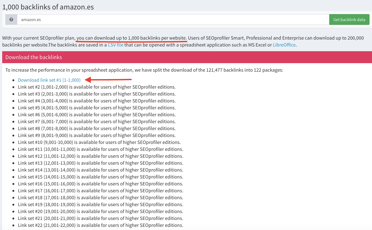 Open Link Profiler te permite descargar gratis en un archivo CSV hasta un máximo de 1.000 enlaces.