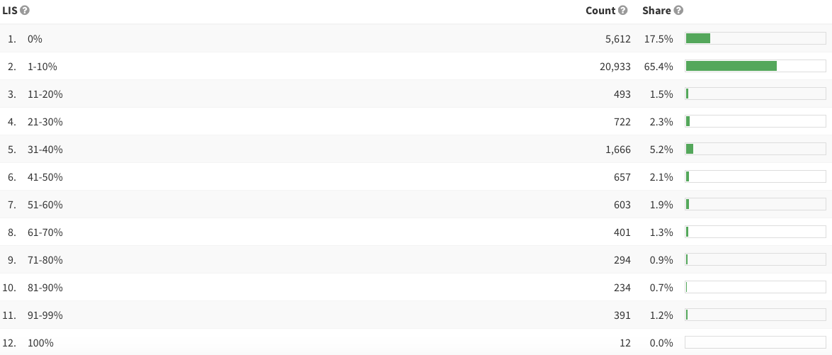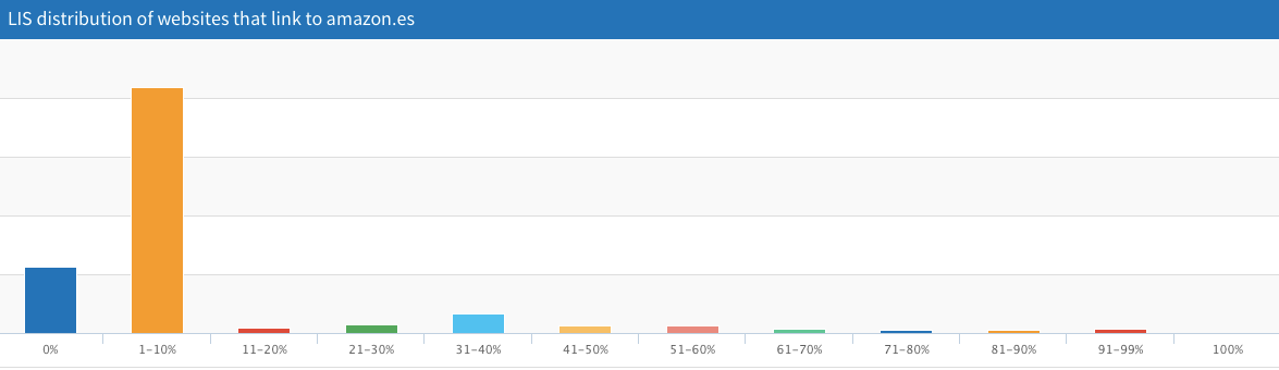 Para aportarnos esta información, la herramienta nos muestra un gráfico con barras que representan la distribución de los sitios web que enlazan al dominio según su LIS (autoridad): del 1 al 10%, del 11 al 20%, del 21 al 30% y así hasta el 100%.