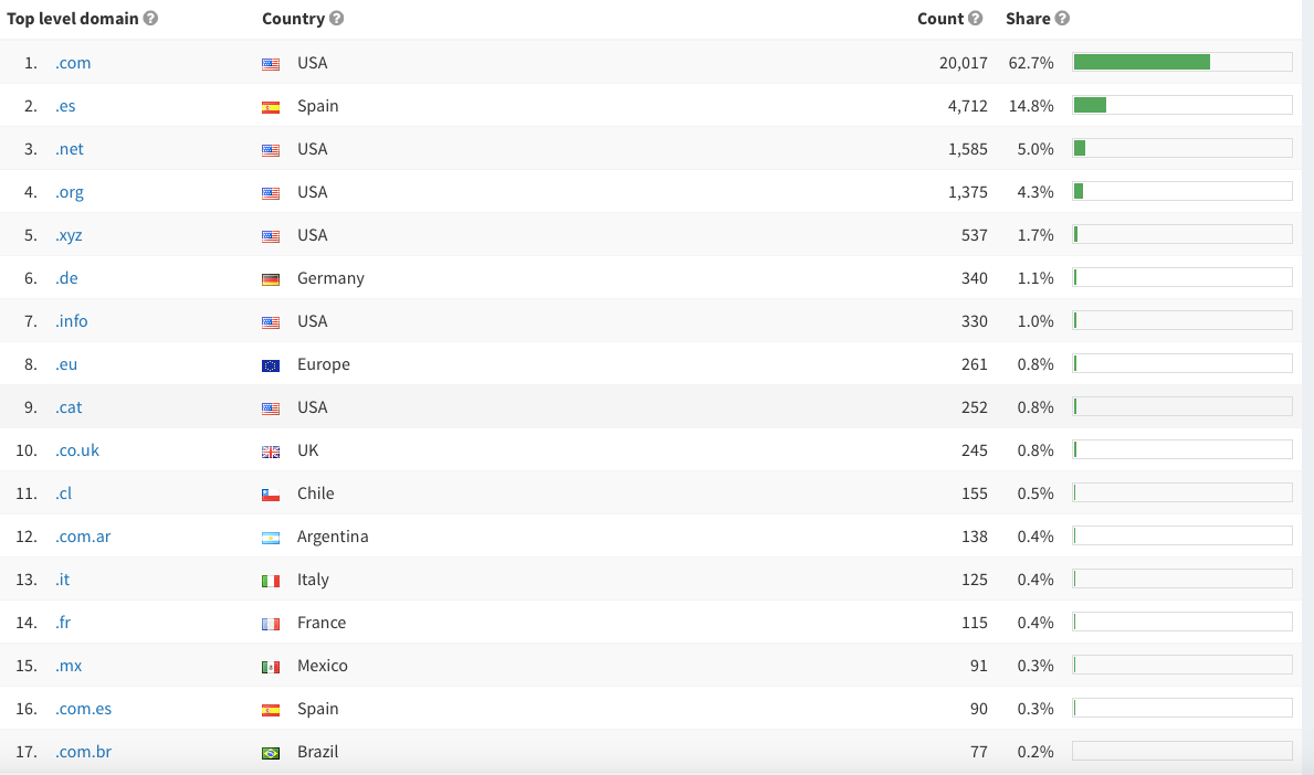 A continuación, te facilita un listado con todas las terminaciones de dominio, el país, el número de enlaces y el porcentaje que cada uno representa sobre el total de backlinks que estén apuntando al sitio web analizado.