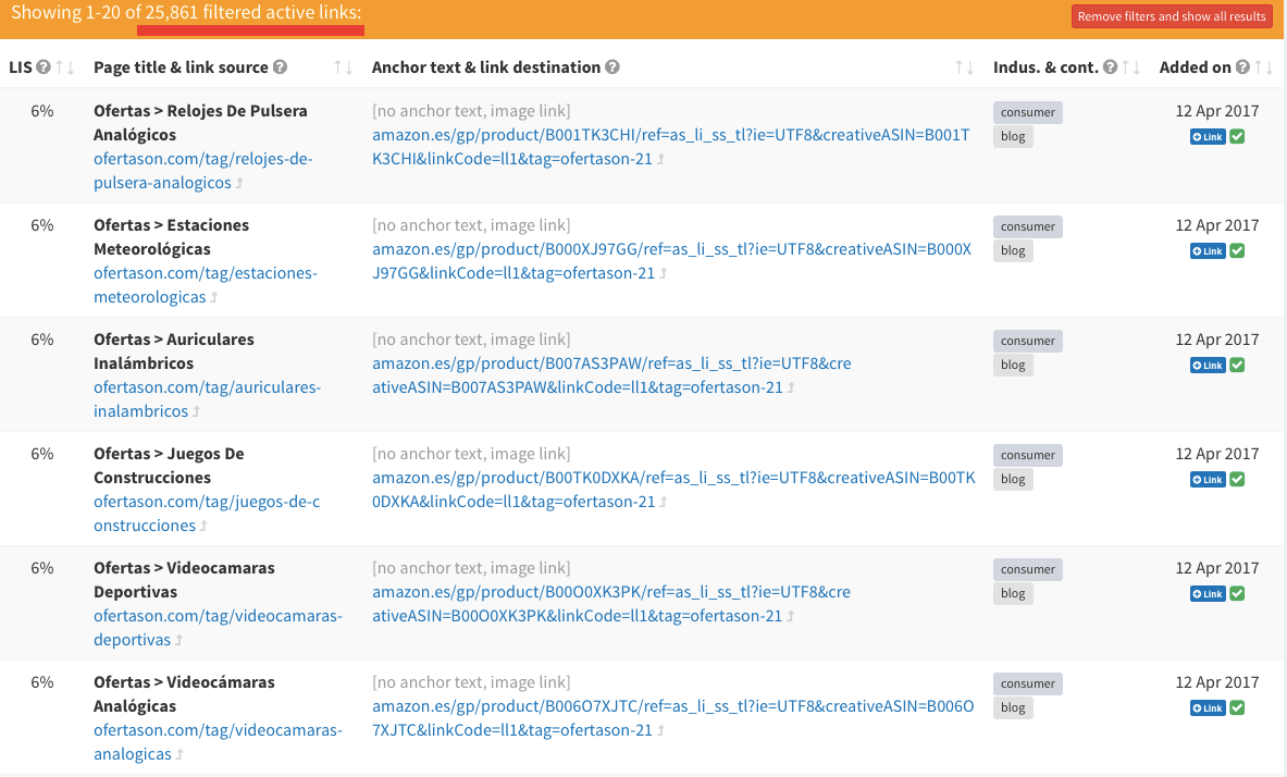 Del total de 121.619 enlaces, los hemos reducido a 25.861. La tabla que nos presenta la herramienta, nos lista todos esos enlaces con la siguiente información: