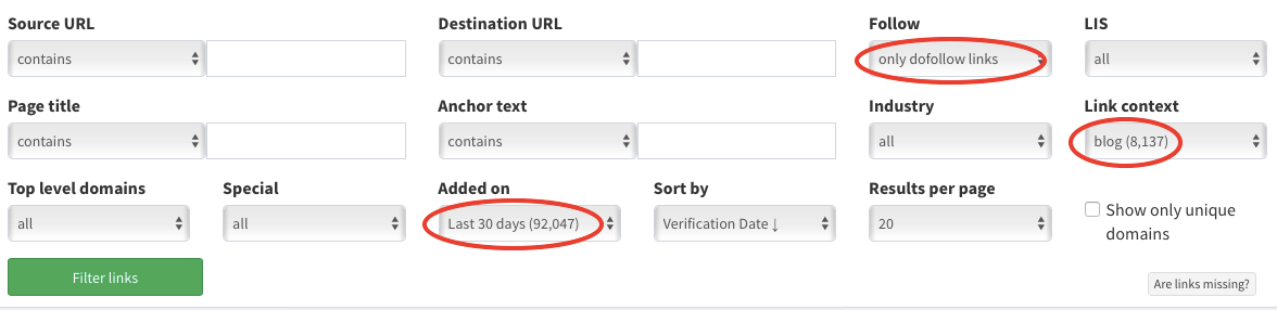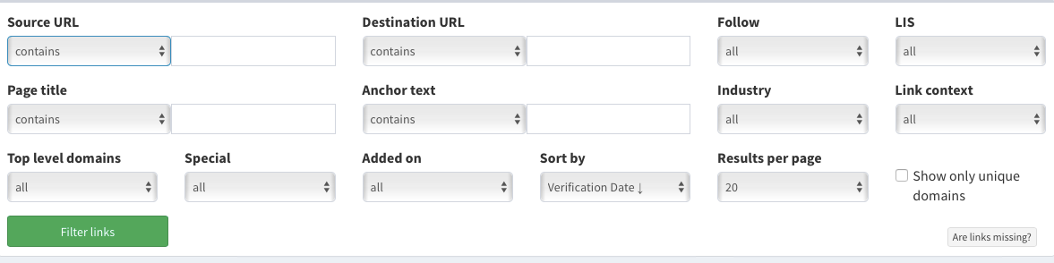 Igualmente, podemos seleccionar que los filtros se apliquen a todos los enlaces o sólo a los enlaces únicos (de distintos dominios).