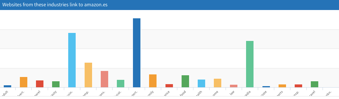 En primer lugar, nos muestra un gráfico con barras que equivalen a las distintas temáticas. Pasando el ratón por cada barra, podrás ver el número de sitios web de cada temática que están enlazando al dominio.