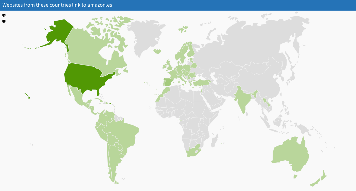 La herramienta nos muestra un mapa y nos destaca en distintos tonos de verde los países de los sitios web que más enlazan al dominio que estemos analizando. Pasando el ratón por cada país, podremos ver directamente el número de enlaces.