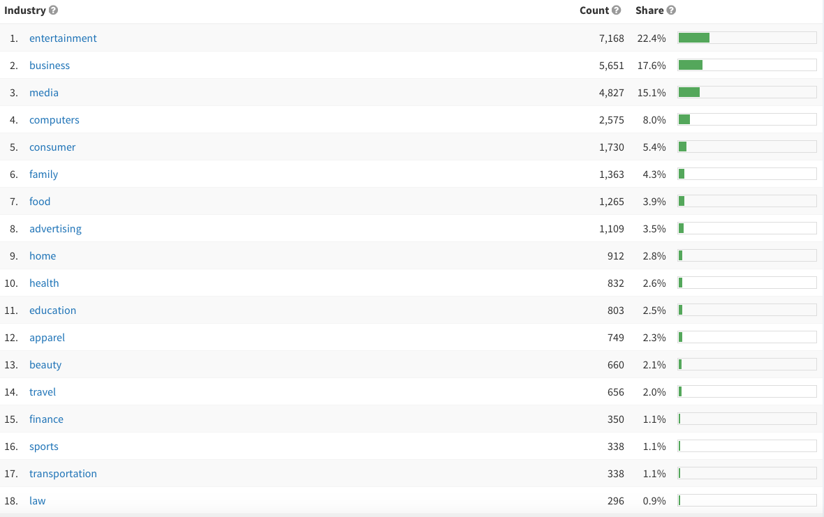 En el apartado «Industries», Open Link Profile nos aporta la información sobre los sectores o temáticas de los sitios web que están enlazando al dominio que estemos analizando.