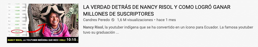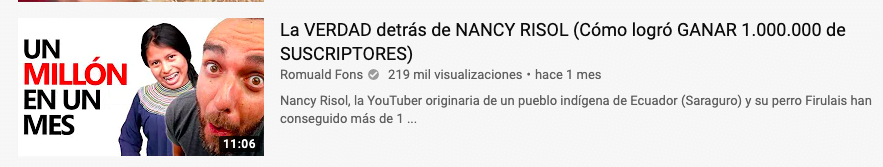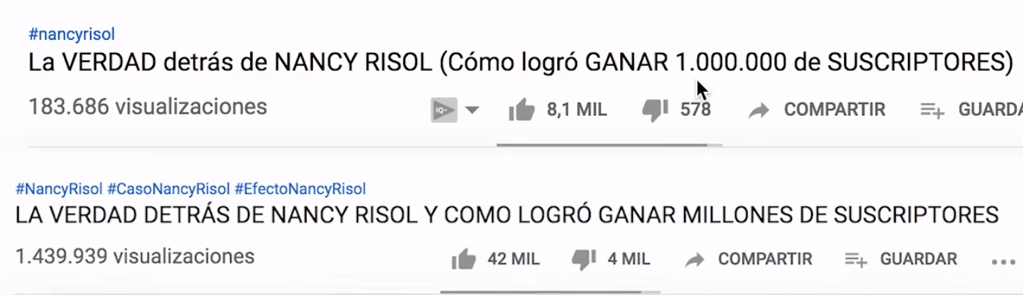 Hace unas semanas me puse en primera posición para la búsqueda de «Nancy Risol» en un momento en que todo el mundo buscaba Nancy Risol y muchos youtubers estaban haciendo vídeos para posicionarse por Nancy Risol.