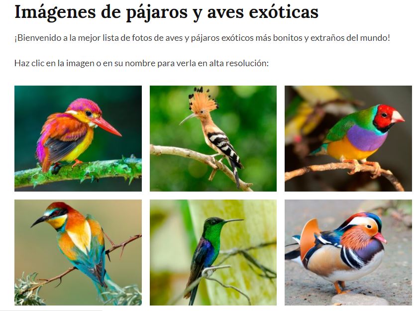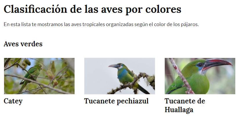Por último, vamos a hacer un texto típico: «En esta lista te mostramos las aves tropicales organizadas según el color de los pájaros».