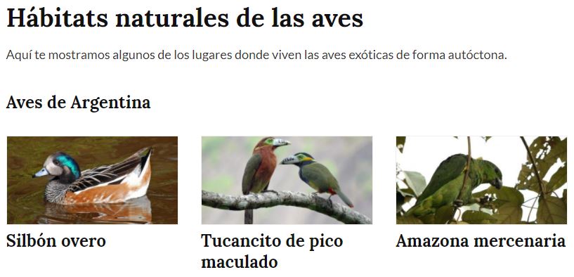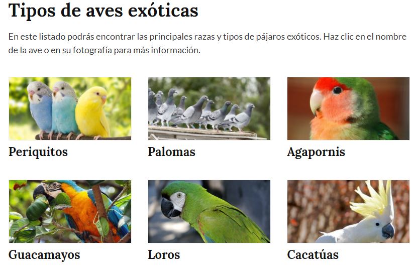 Tampoco nos hemos complicado la vida: un H2, dos líneas de texto y una galería de fotos bonitas de aves exóticos.