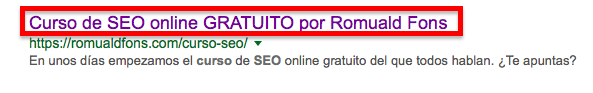 «Curso de SEO online GRATUITO por Romuald Fons» es el meta title o title de la landing de mi curso de SEO.