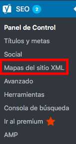 Una vez activado, en la misma barra lateral de tu WordPress ve a la sección SEO, clica y verás la opción «Mapas del Sitio XML».