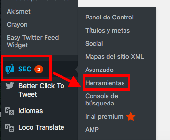 Si tienes WordPress y tienes instalado el plugin SEO Yoast, puedes ir directamente a Herramientas – «Editor de archivos» y ahí te encontrarás el contenido de tu archivo htaccess.