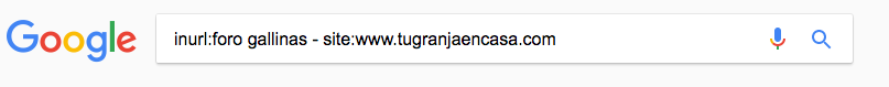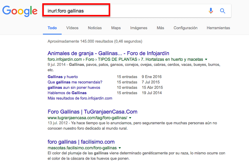 Nos vamos a Google y en lugar de buscar directamente «foro gallinas», utilizamos la footprint «inurl». ¿Para qué? Para acotar la búsqueda, de forma que Google sólo nos muestre los resultados que contengan la palabra «foro» en la URL y hablen de gallinas.