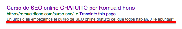 El pequeño texto que aparece justo debajo del título o meta title y la URL es la meta descripción.