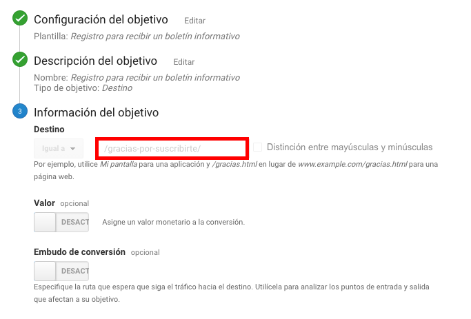 En este caso, indicaremos que esa página sea la de «gracias por suscribirte», ya que es en la que aterrizarán aquellos usuarios que ya hayan completado el proceso del registro que hemos establecido como objetivo.