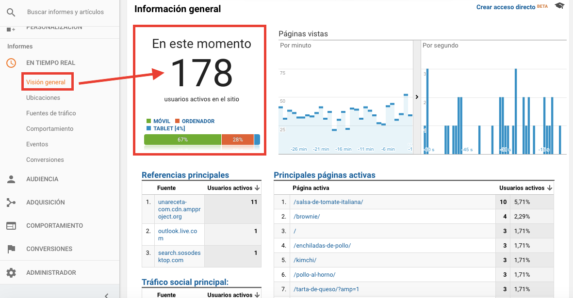 En este panel principal, accedemos a la información general de lo que está ocurriendo en nuestro sitio web en tiempo real. El informe es muy visual.